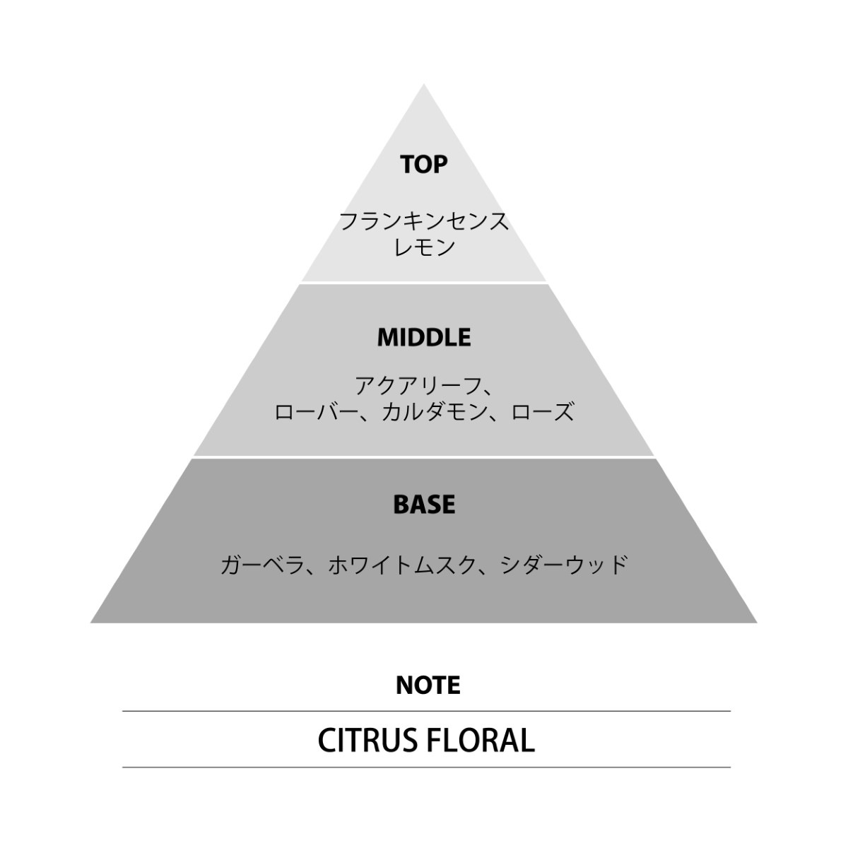 フランキンセンスとレモンがキリッとしたシトラス系の強気なトップ。ミドルのフローラル調では上品な爽やかさから、カルダモンやガーベラの深みがあふれ出る気品を感じる香り